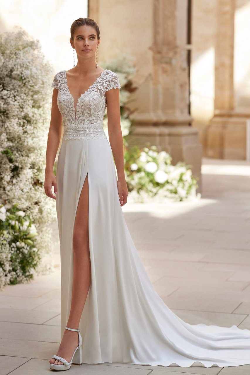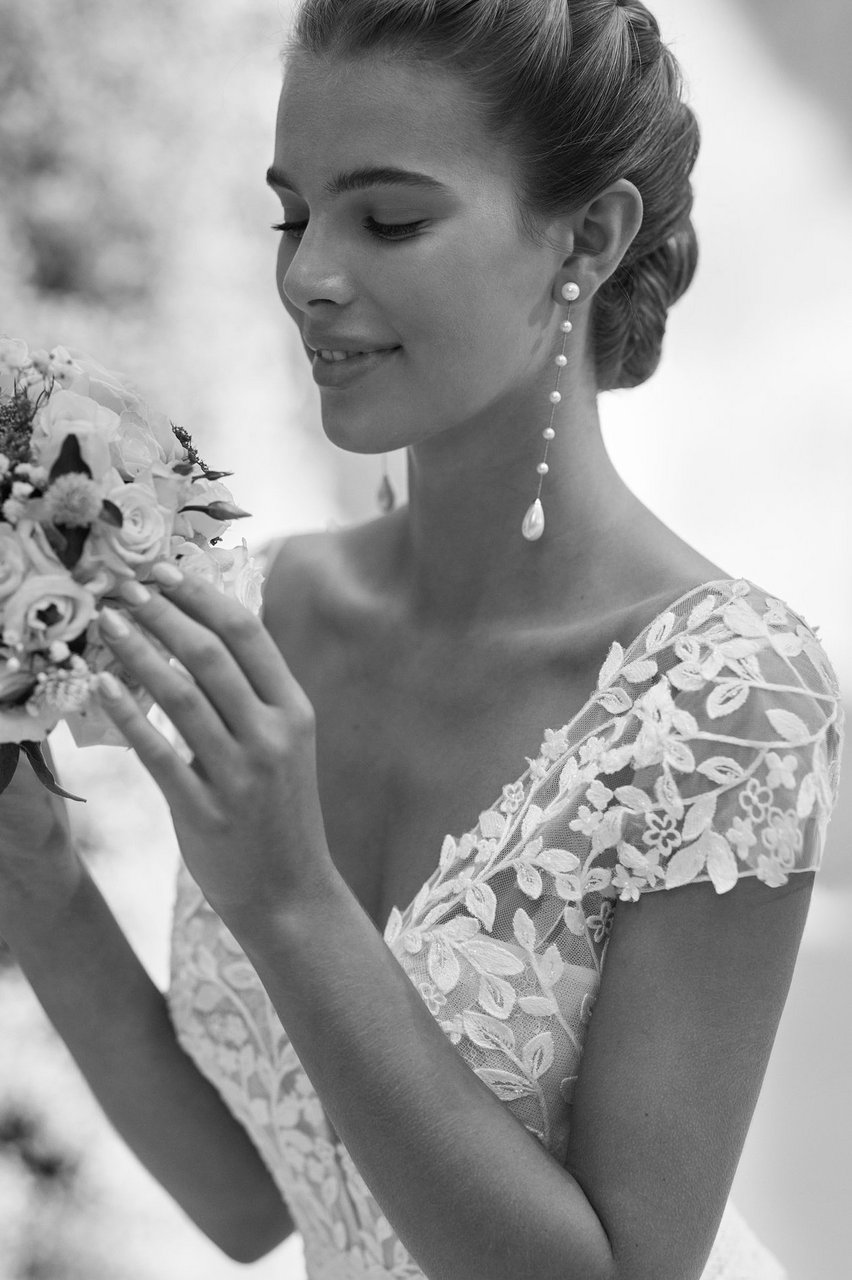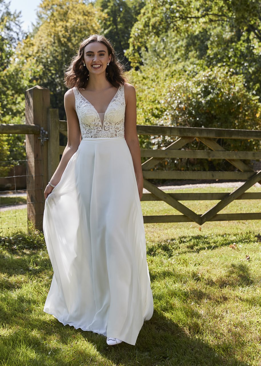 Eine graphische Spitze, mit Glitzereffekt im Oberteil. Seitliche Cut-Outs und dazu ein leichter fliessender Chiffonrock der die Figur perfekt umschmeichelt.